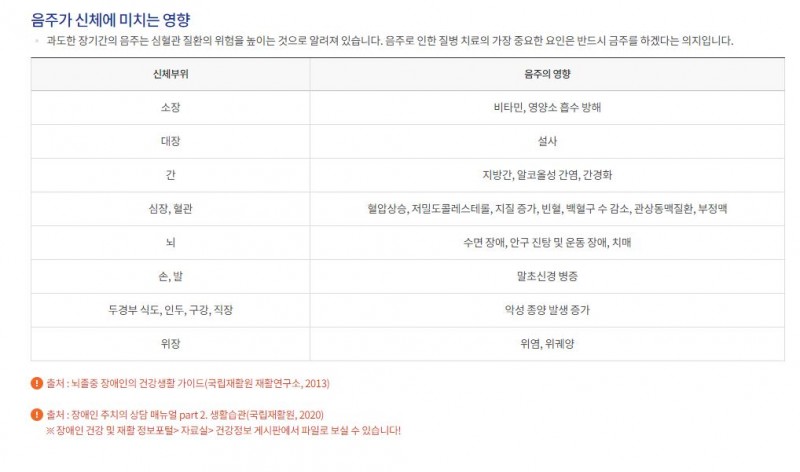 -건전음주의 중요성 음주는 전 세계적으로 신체적, 정신적, 사회적 문제와 밀접하게 관련되어 있습니다. 비록 약간의 음주는 심혈관계질환과 같은 일부 질환에 대해 예방 및 사망률 감소 효과가 있다고 하나, 과도한 음주는 건강에 좋지 않은 영향을 미칩니다. -세계보건기구의 보고서에 따르면 여러급성 만성질환(췌장염,알코올성 간염, 간경화증, 뇌졸중, 뇌출혈, 고혈압,구강암,식도암등)을 포함하여 현재 60가지 이상의 질병이 음주와 직 간접적으로 연관이 되어 있는것으로 알려져있습니다. 특히 장애인의 경우 장애 유발질환이나 장애 동반질환으로 인해 약을 통한 관리를 하는 경우가 많음으로 음주행위는 삼가야 합니다.