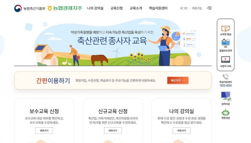 주요내용 전화문의: 농협중앙회(02-2080-8528) 신청방법: 교육운영기관 방문 또는 축산관련종사자 교육시스템 신청 접수기관: 농협중앙회 경제지주 축산디지털컨설팅부 지원형태: 현금, 기타 지원대상 -축산업 허가, 등록자 -가축거래상인등록자 -축산차량 소유자, 운전자
