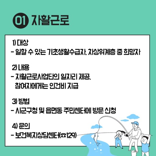 수급자 및 저소득층이 스스로 자립할 수 있도록 자활능력 배양, 기술습득 지원 및 근로 기회 제공