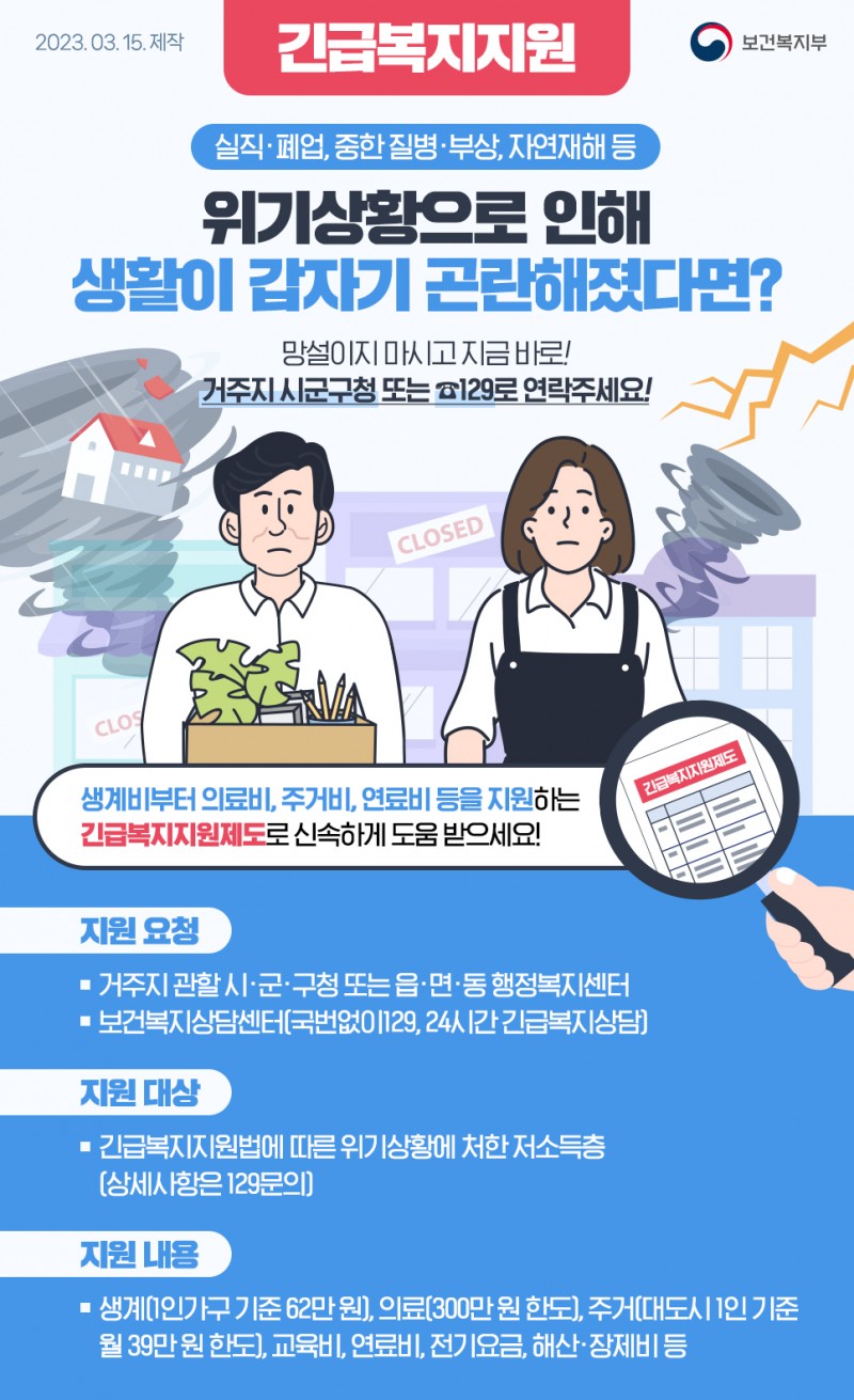 생계비부터 의료비, 주거비, 연료비 등을 지원하는 긴급복지지원제도로 신속하게 도움받으세요