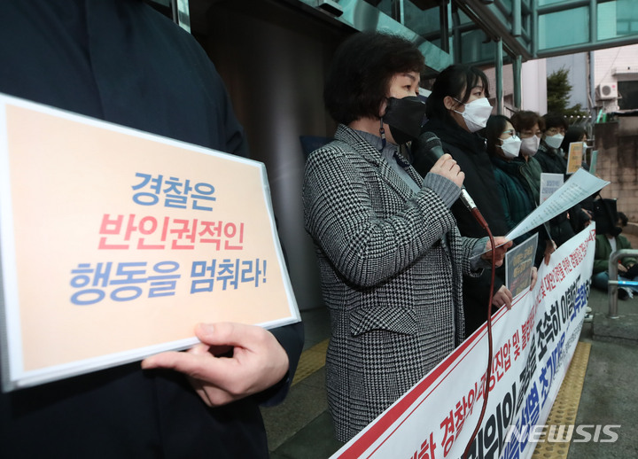장애우권익문제연구소, 장애인차별금지추진연대 등 회원들이 14일 오후 서울 서대문구 경찰청 앞에서 발달장애인 경찰 과잉진압 및 불법체포 사건 규탄 및 대안마련 위한 경찰청장 면담 요청 기자회견을 하고 있다.