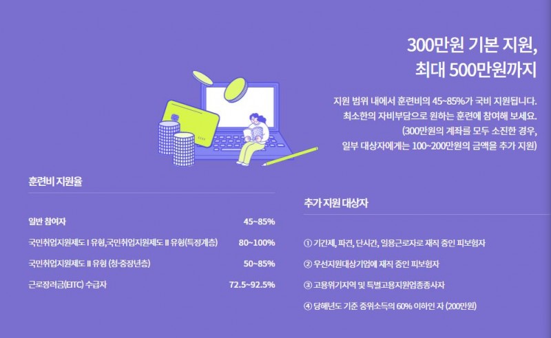 국민내일배움카드-300만원 기본 지원, 최대 500만원까지~