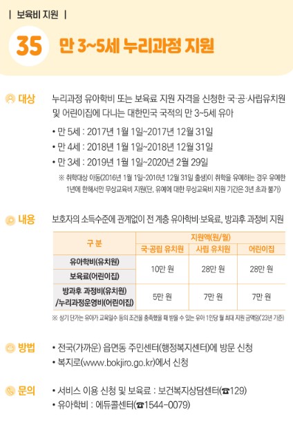 3~5세 누리과정 도입으로 유치원·어린이집에 국가수준 공통 교육과정(누리과정)을 적용함에 따라, 보호자의 소득수준에 관계없이 전 계층 유아학비, 보육료 지원