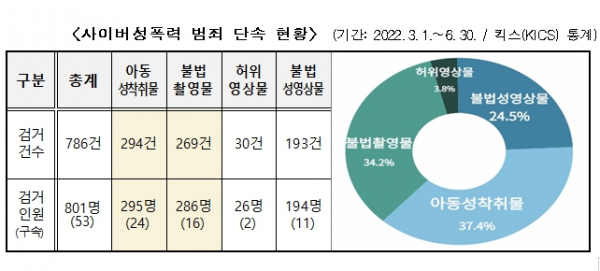 경찰청 국가수사본부(사이버수사국)는 올해 3월부터 10월까지 8개월 동안 사이버성폭력 집중단속을 시행 중이며, 전국 경찰관서에서 집중단속 4개월(3. 1.∼ 6. 30.) 동안 사이버성폭력 피의자 총 801명을 검거하였고, 이 중 53명을 구속하였다.