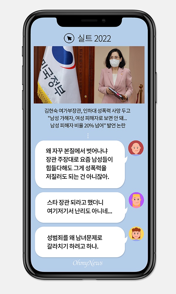 이에 누리꾼들은 여가부 장관의 인식을 문제 삼았습니다. 한 누리꾼은 "왜 본질에서 벗어나는 대답을 하느냐"며 "이번 사건의 가해자는 남성, 피해자는 여성이다. 여가부 장관 주장대로 요즘 남성들이 힘들다 해도 그게 성폭력을 저질러도 되는 건 아니다"라고 꼬집었습니다.