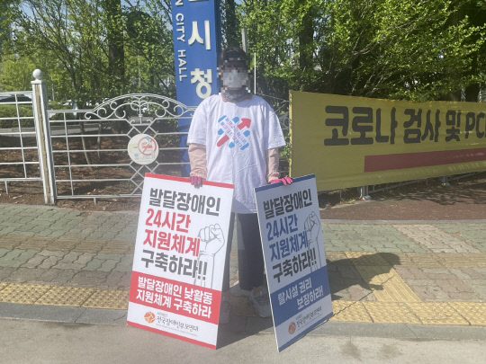 지난 9일 충남장애인부모회 천안지회 회원이 천안시청 앞에서 발달장애인 돌봄 지원 확대를 요구하는 1인 시위를 하고 있다. 사진=박하늘 기자