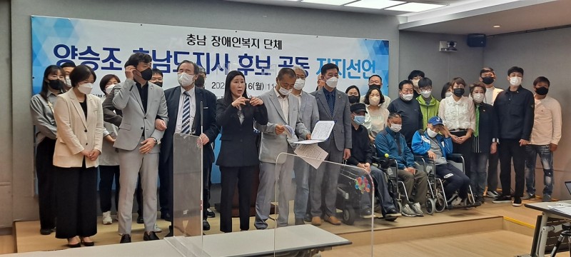 지역 13개 장애인단체 대표들도 이날 같은 장소에서 기자회견을 열고 "양 후보는 지난 민선 7기 충남도지사로서 장애인 시내버스비 무료, 중증장애인 119구급 서비스 시행, 65세 이상 중증장애인 돌봄시간 확대 등 장애인 권익과 이동권 향상을 휘해 노력했다"며 지지를 선언했다.