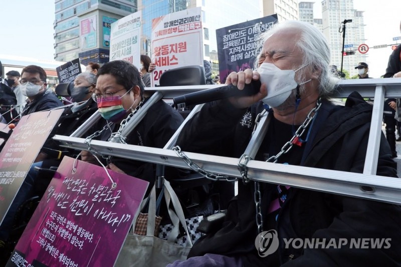 전국장애인차별철폐연대(전장연) 박경석 상임공동대표(오른쪽) 등 장애인들이 16일 출근 시간대에 서울 신용산역에서 대통령실로 향하는 한강대로의 횡단보도를 점거한 채 장애인 권리 예산 보장 등을 요구하는 시위를 하고 있다. 2022.5.16