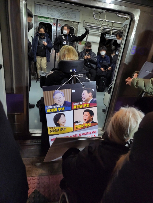 박경석 전장연 대표는 23일 서울지하철 4호선 서울역에서 선전전을 벌인 뒤 “오늘부로 출근길 시위를 멈춘다”고 밝혔다. 전장연은 장애인 권리 보장 예산 증액을 요구하며 지난해 12월 3일부터 모두 21차례 시위를 진행했다. 앞서 지난 21일 심상정 정의당 대선 후보가 대선후보 토론회에서 장애인 이동권 문제를 거론하는 등 정치권이 중재에 나선 것도 잠정 중단 배경이 됐다.