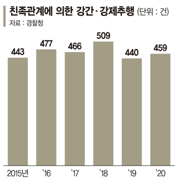 26일 경찰청에 따르면 성폭력범죄의 처벌등에 관한 특례법상 친족관계에 의한 강간과 강제추행은 지난 2015년부터 지난해까지 매년 400건 넘게 발생했다. 지난해에는 459(강간 123·강제추행 336)건으로 2019년 440건(강간 122·강제추행 318) 대비 조금 늘었다.