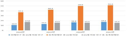 고령인구의 통상적 기준인 65세 이상의 등록 장애인은 약 135만7000명으로, 전체 등록 장애인의 절반 이상인 51.3%였다. 등록 장애인 중 65세 이상의 비율은 2010년 37.1%, 2015년 42.3%, 2020년 49.9%로 꾸준히 높아지고 있다.
