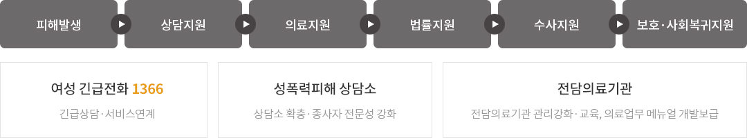 | 의료비 지원 | 신체적·정신적 치료가 필요한 성폭력 피해자에게 의료비 지원 |